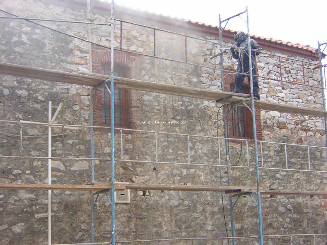 0 Καθαρισμός εκκλησίας. Έγινε αφαίρεση του επιχρίσματος (Σοβά) και καθαρισμός σε βάθος του άρμου με την υδροβολή. Ακολούθησε εκ νέου αρμολόγηση.